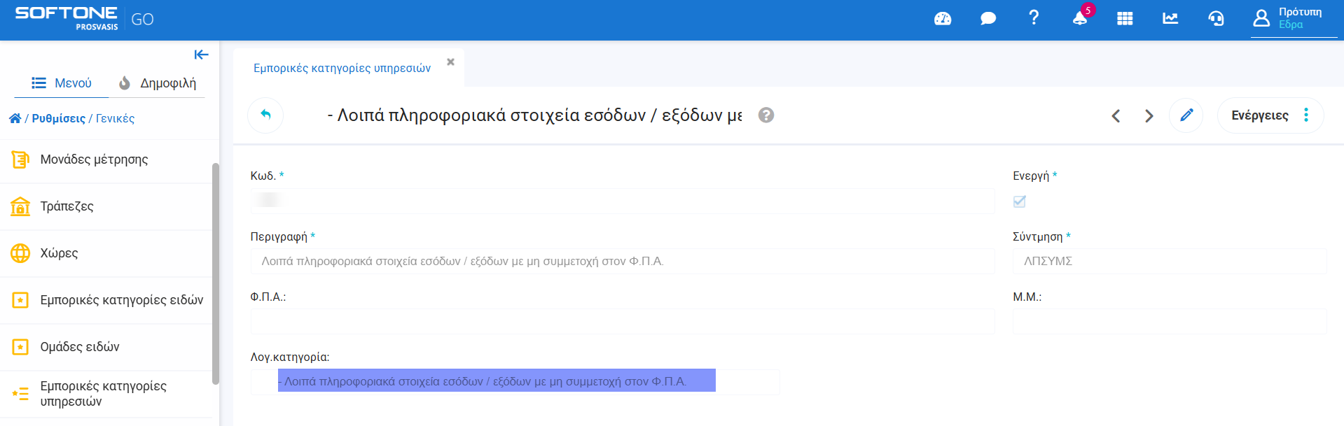 Προστέθηκε η δυνατότητα δημιουργίας νέας εμπορικής κατηγορίας υπηρεσιών με επιλογή στην λίστα των λογιστικών κατηγορίων «Λοιπά πληροφοριακά στοιχεία εσόδων / εξόδων με μη συμμετοχή στον Φ.Π.Α.»