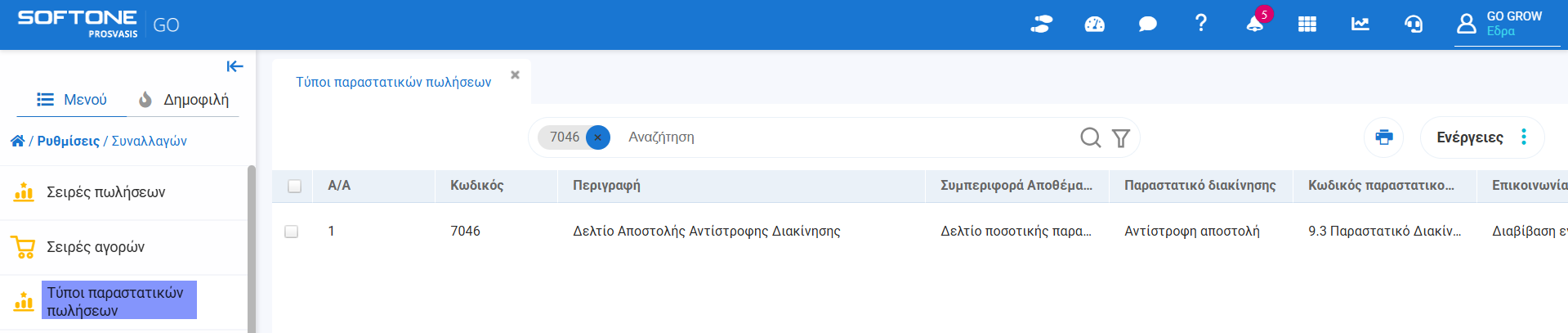 - Ενσωματώθηκαν νέοι Τύποι πωλήσεων 7046 -Δελτίο Αποστολής Αντίστροφης Διακίνησης και Αγορών 2046 - ΔΑ Αντίστροφης Διακίνησης Από Προμηθευτή