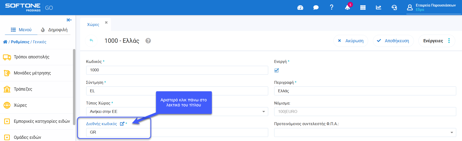 - Από το μενού Ρυθμίσεις – Γενικές – Χώρες, ορισμός ένδειξης υποχρεωτικότητας συμπλήρωσης του πεδίου «Διεθνής κωδικός» και ενσωμάτωση ταχείας προβολής του «Κατάλογος κωδικών του ISO χωρών 3166-1»