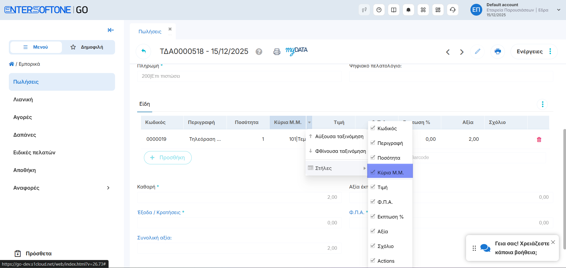 Προστέθηκε νέα στήλη «Κύρια Μ.Μ.» στις γραμμές Ειδών και Υπηρεσιών, κατά την καταχώρηση παραστατικού, ώστε ο χρήστης να έχει άμεση εικόνα της κύριας μονάδας μέτρησης κάθε γραμμής.
