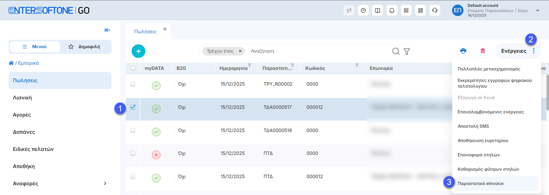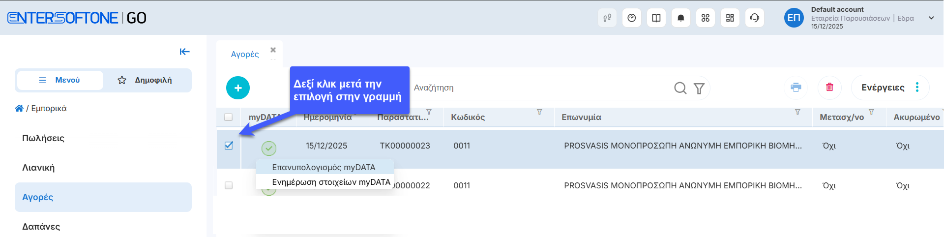 Προστέθηκε η δυνατότητα εκτέλεσης «Επανυπολογισμού myDATA» και «Ενημέρωσης στοιχείων myDATA» μέσω δεξιού κλικ στις επιλεγμένες εγγραφές.