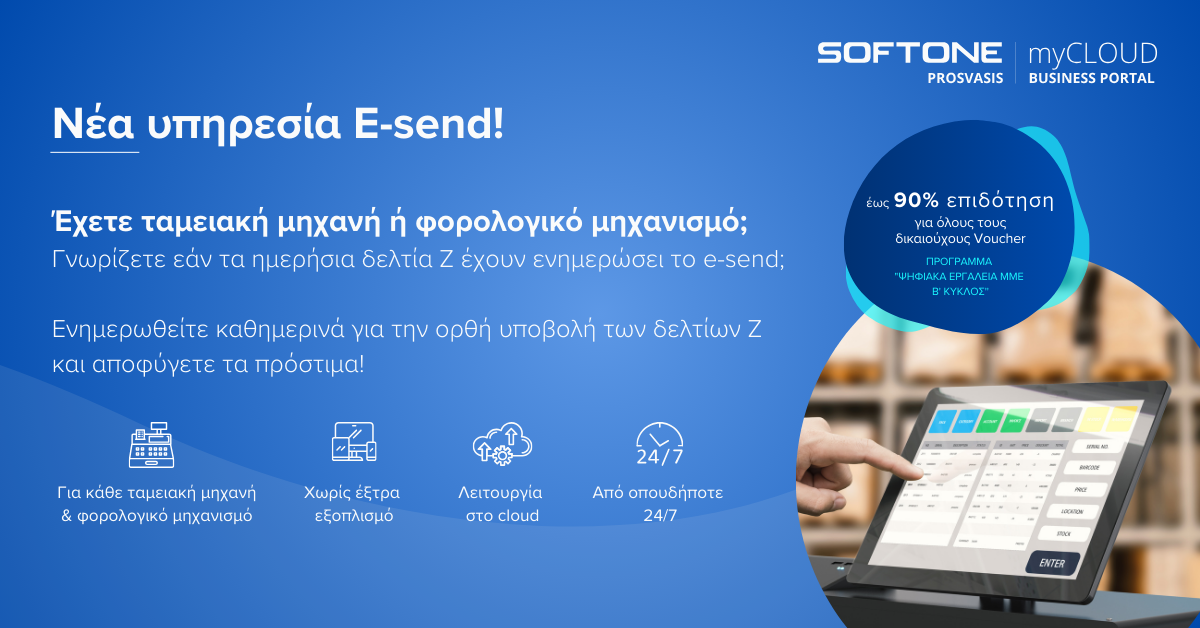 Η SOFTONE PROSVASIS, στο πλαίσιο συνεχούς εξέλιξης των προϊόντων και των υπηρεσιών της, σας παρουσιάζει τη νέα υπηρεσία E-send στο SOFTONE myCLOUD. Η νέα υπηρεσία εξασφαλίζει την πλήρη και αποτελεσματική ενημέρωση των επιχειρήσεων που χρησιμοποιούν ταμειακές μηχανές και φορολογικούς μηχανισμούς, μειώνοντας σημαντικά τον απαιτούμενο χρόνο διαχείρισης και ελαχιστοποιώντας τον κίνδυνο λαθών και προστίμων.